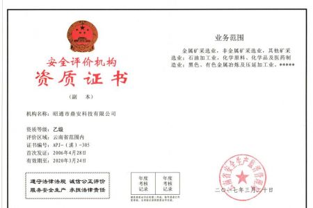 2003年11月10日,昭通市鼎安科技有限公司成立,初始主要從事第三方安全工程技術(shù)服務(wù),經(jīng)多年運營,發(fā)展為多專業(yè)綜合科技平臺,為社會提供多種專業(yè)技術(shù)服務(wù)工作。 現(xiàn)公司注冊資金為1200萬元,公司法定代表人:毛衛(wèi)旭。公司主要業(yè)務(wù):安全評價、安全標準化評審、安全工程技術(shù)服務(wù);環(huán)境監(jiān)測、職業(yè)衛(wèi)生檢測、檢驗;法律訴訟及非訴訟服務(wù);司法鑒定、固定資產(chǎn)投資項目節(jié)能服務(wù);工程咨詢;工程測量測繪;安全教育培訓(xùn)等。是安全生產(chǎn)服務(wù)、安全教育培訓(xùn)機構(gòu),也是環(huán)境監(jiān)測和職業(yè)衛(wèi)生服務(wù)機構(gòu),同時也是綜合的檢測檢驗、綜合科技平臺服務(wù)機構(gòu)。多年來為公、檢、法、司、軍、警、海關(guān)、仲裁、安監(jiān)、工礦商貿(mào)企業(yè)、社會團體及個人提供多專業(yè)技術(shù)服務(wù)。